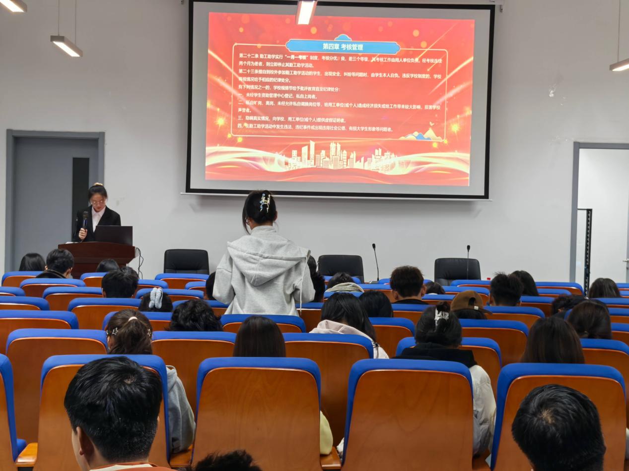 最后,副主席王靖文做离场总结,他再次强调了学生手册的重要性。它不仅是山农工的标识,还是每位新生的“入学牌”,学生手册引导同学们从中学习,规范行为,减少矛盾和冲突,收获积极向上的学习和生活氛围。