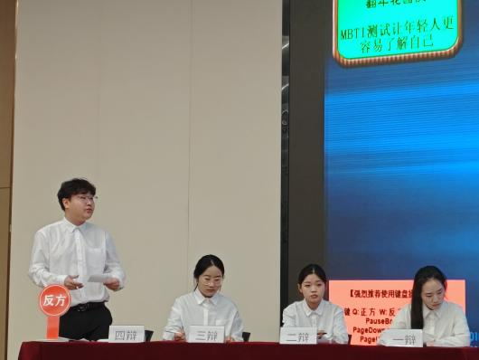 辩论场上,正方辩手立场坚定,论点鲜明,他们的观点是“MBTI测试让年轻人更难了解自己”。一辩开篇立论,有条不紊地阐述观点,逻辑严谨,为全场辩论奠定了坚实的理论基础。在随后的攻辩环节中,正方二辩和三辩言辞犀利,针对反方的漏洞连连发问,步步紧逼,不给对手丝毫喘息的机会,展现出了出色的应变能力。