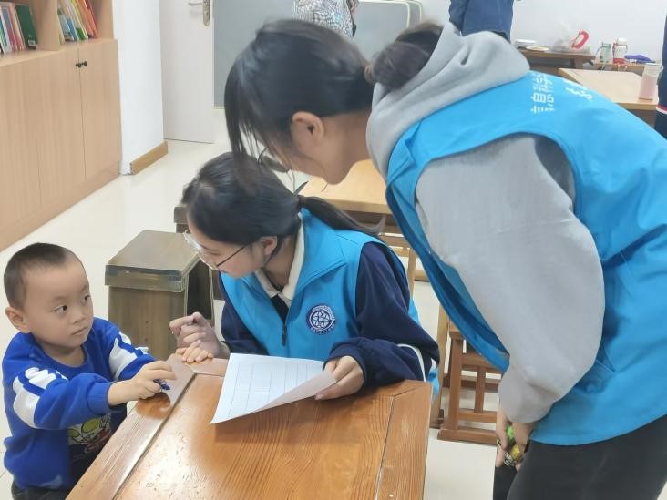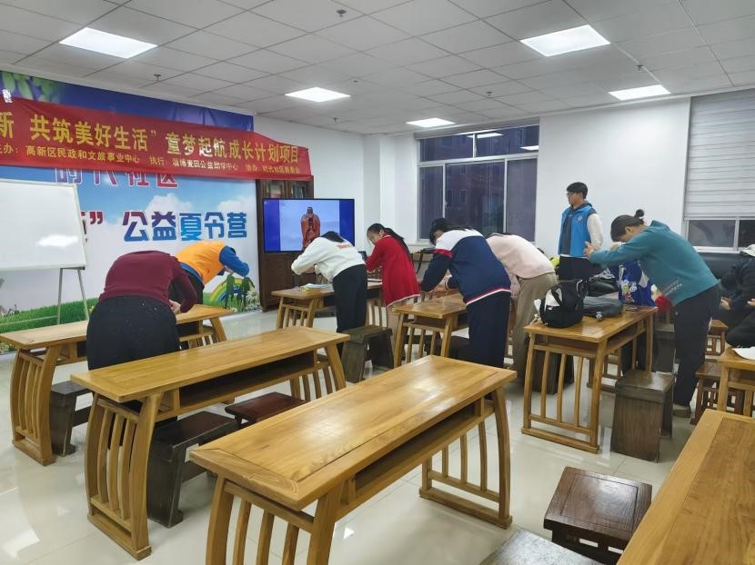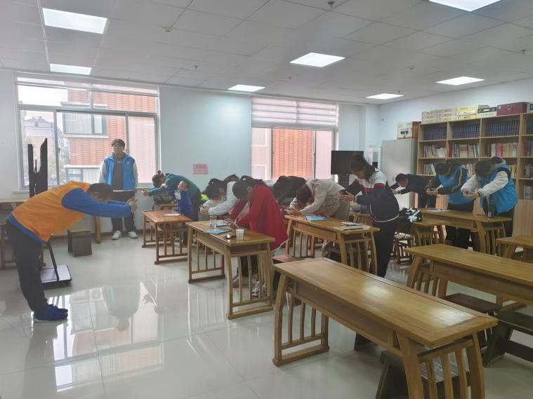 在活动开始之前,信工学院的志愿者布置好茶歇,积极配合社区的工作人员,并协助讲师进行活动。活动开始,由讲师带领家长和孩子共同朗读《弟子规》,让孩子们在朗朗上口的诵读中感受传统文化的魅力,学习做人做事的基本道理。在领读结束后,活动安排了学习传统拜师礼的环节。通过模拟古代拜师仪式,孩子们不仅了解了尊师重道的传统文化,还学会了如何表达对师长和长辈的尊敬和感激。为了让孩子和家长在忙碌的生活中找到片刻宁静,活动特别安排了静心环节。通过冥想和深呼吸,大家共同体验内心的平静与和谐。