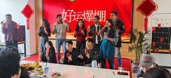 互动环节中,外国学生激情朗诵诗词,中国学生则迅速进行诗词接龙抢答。这不仅考验了大家的诗词储备,更增进了中外学生之间的默契与互动。每一位答对的同学都获得了抽取福包的机会,现场气氛热烈非凡。而最令人期待的当属“好运爆棚”环节,吃到“糖果饺子”的幸运儿们依次上台抽取福包,福包内的小礼品给大家带来了连连惊喜,将活动的欢乐氛围持续升温。活动接近尾声,全体师生合影留念,用镜头定格这一珍贵的瞬间,记录下中外学子在冬至佳节结下的深厚情谊。