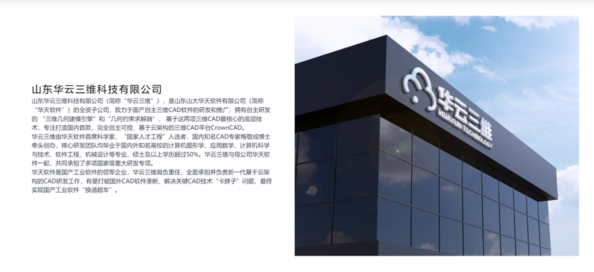 山东华云三维科技有限公司(简称“华云三维”),作为 山东山大华天软件股份有限公司(简称“华天软件”) 的全资子公司,致力于国产三维CAD软件的研发和推广,拥有自主研发的“三维几何建模引擎”和“几何约束求解器”,基于这两项三维CAD最核心的底层技术,专注打造国内基于 云架构的三维CAD平台CrownCAD。华云三维由华 天软件首席科学家、“国家人才工程”入选者、国内知名CAD专家梅敬成博士牵头创办。其核心研发团队均毕业于国内外知名高校,专业涵盖计算机图形学、应用数学、计算机科学与技术、软件工程、机械设计等,硕士及以上学历占比超过50%。华云三维与母公司华天软件紧密协作、协同攻坚,共同承担了多项国家级重大研发专项。华天软件作为国产工业软件的领军企业,华云三维则肩负重任,全面承担并负责新一代基于云架构的CAD研发工作,助力实现国产工业软件的“换道超车”。