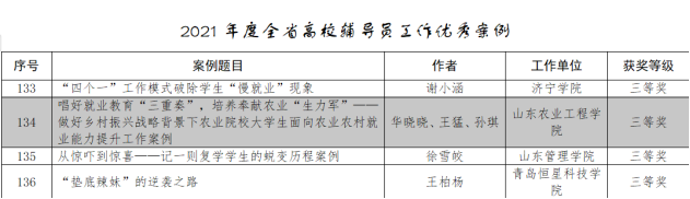 近日,中共山东省委教育工委就组织开展的全省高校辅导员2021年度优秀工作案例评选结果进行了公布,bat365农业科技学院华晓晓、王猛与孙琪三位老师老师撰写的《唱好就业教育“三重奏”, 培养奉献农业“生力军”——做好乡村振兴战略背景下农业院校大学生面向农业农村就业能力提升工作案例》荣获了三等奖。