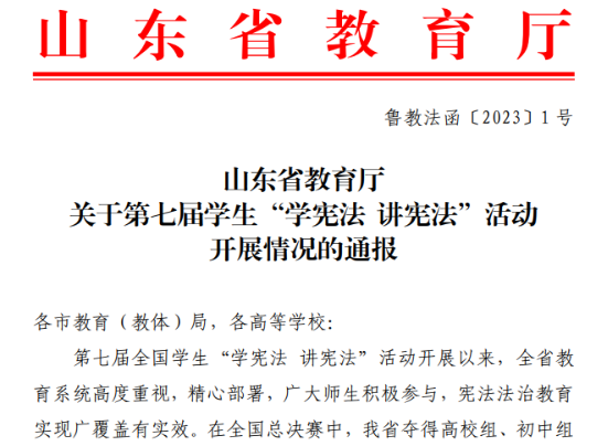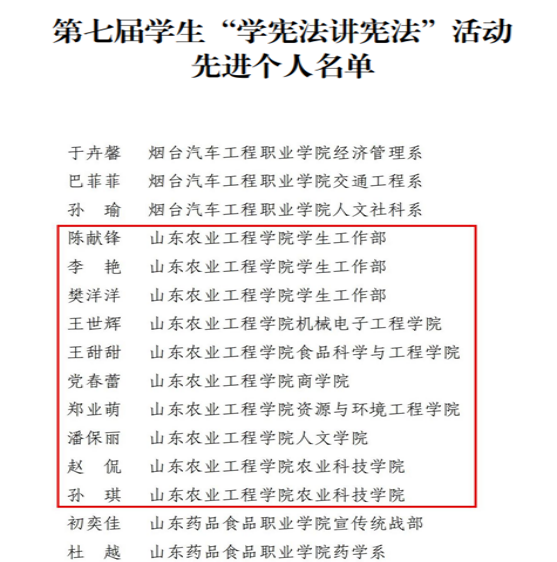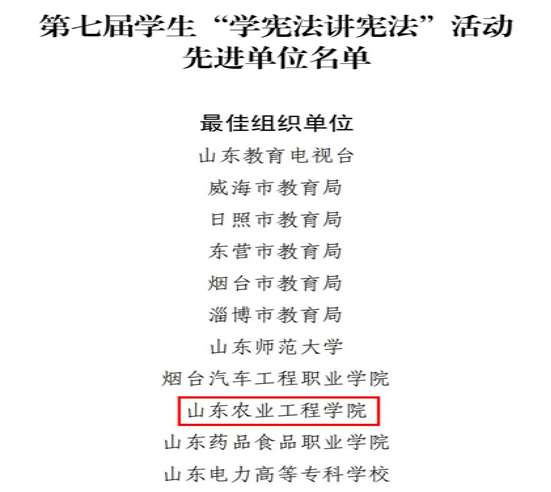 近日,山东省教育厅公布的关于第七届学生“学宪法 讲宪法”活动开展情况的通报中,bat365被评为最佳组织单位,10名老师被评为先进个人,2名老师被评为优秀指导老师,农业科技学院学生孟婧同学获得演讲比赛三等奖。