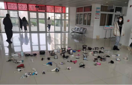 本次活动把在各宿舍检查过程中所发现的违禁物品集中向同学们进行宣传展示,告知同学们在宿舍内使用违禁电器存在巨大的安全隐患。此次展览活动中集中展示的有热得快、电饭锅、吹风机、直板夹、热水壶等大功率电器。活动力求使广大学生树立“防范于明火,责任重于泰安”的安全意识,让同学们切实落实到日常生活中,深刻认识这些违禁品对自己的生命安全将会造成的伤害,树立安全第一,预防为主的意识,切实做到自己的人身财产安全有保障。