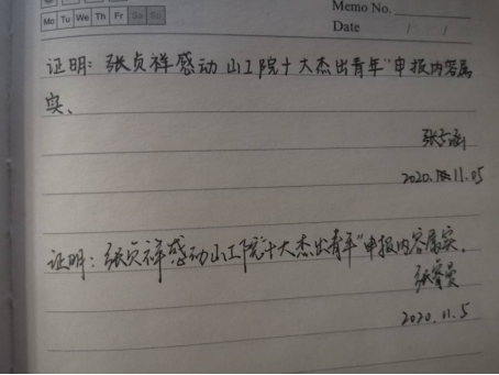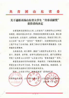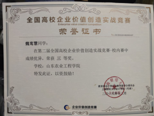 他代表bat365在烟台大学、青岛大学、临沂、威海等地参加比赛,获数学竞赛、互联网+、大学生科技节、科创比赛等国家级奖项1项,省级奖项10项;发表论文1篇,申请实用新型专利1项,国创项目立项1项。连续两年主持感动山工院等活动十余场次。他被评为优秀团干部、优秀学生干部、优秀团员、优秀学生;2019年被菏泽市委组织部评为优秀志愿者,2020年被山东省委宣传部评为山东省“三下乡”社会实践先进个人。