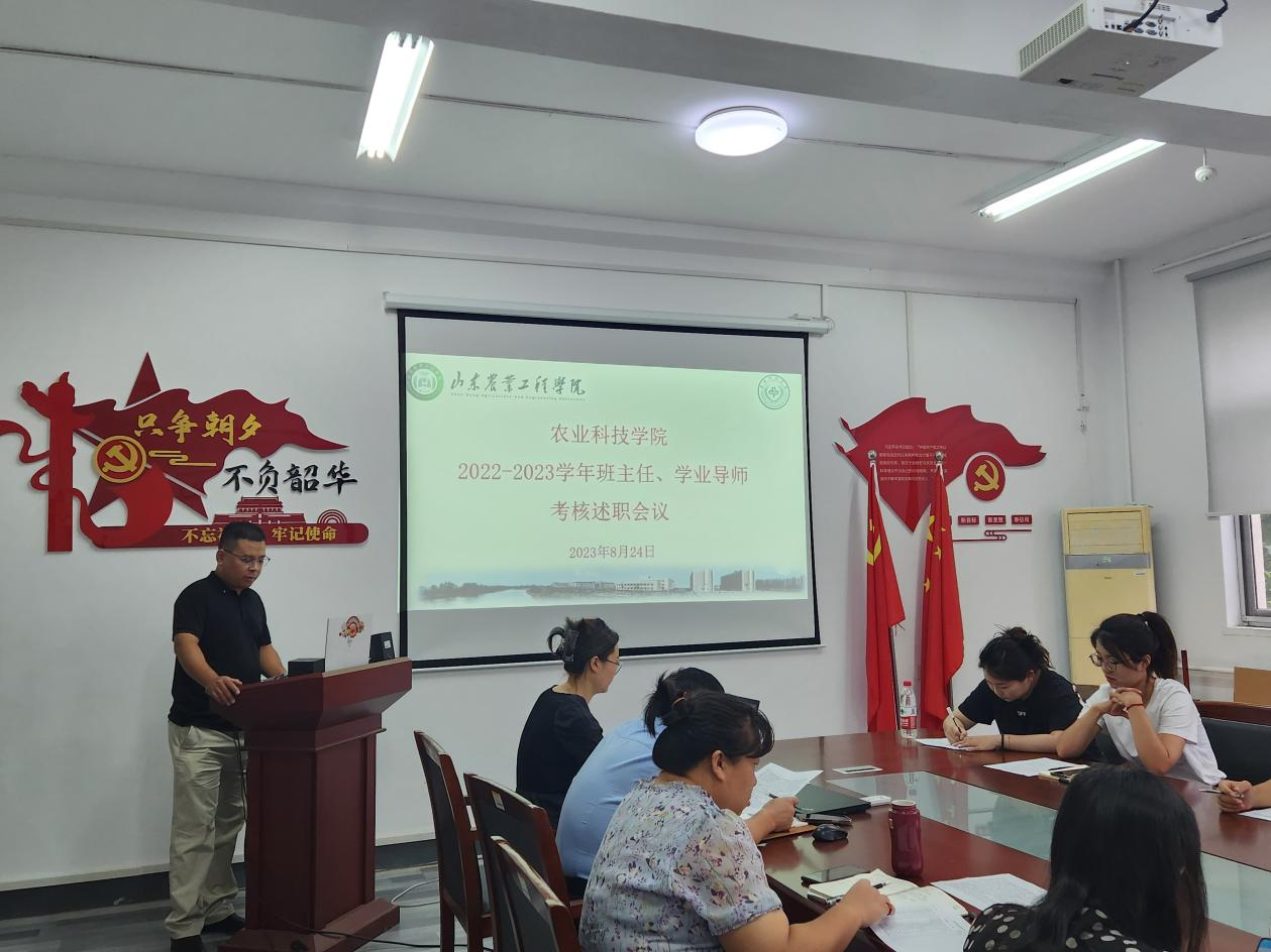 会上,王猛书记根据《bat365正版唯一官网班主任、学业导师管理办法(修订)》【山工院发〔2022〕116 号】、《农业科技学院班主任、学业导师工作考核细则》,对班主任、学业导师工作管理及具体考核办法进行了详细介绍,并对此次考核述职提出相关要求。