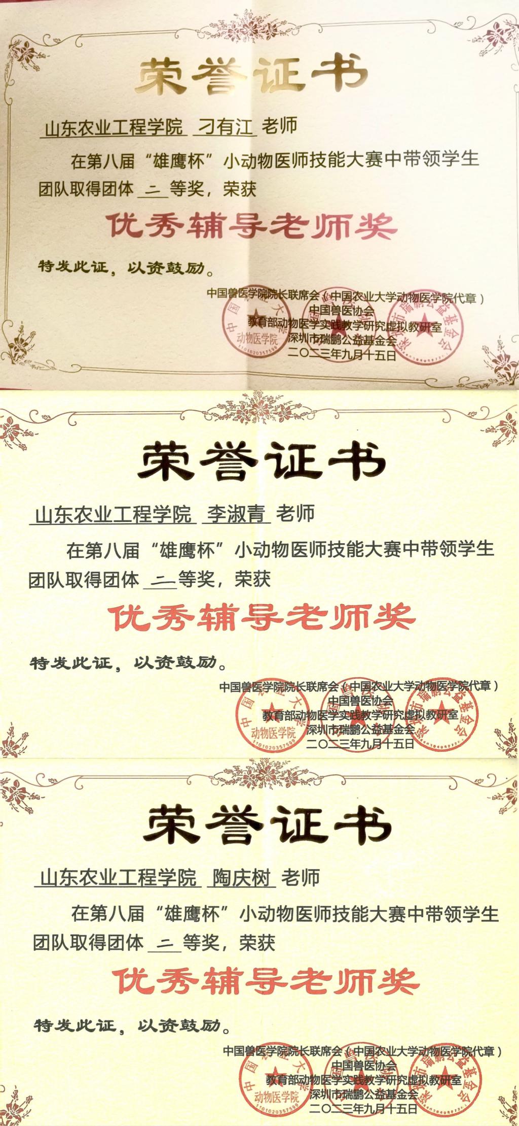 比赛由理论考试、现场竞答及兔胃切开术、血涂片制备及判读、外科徒手打结3个实操项目组成。备赛过程中,陶庆树、李淑青等老师给予同学悉心指导,同学们强化了理论学习与实操训练。比赛中他们不畏强手,笔试与知识竞答环节沉着冷静、机智应对;实操中齐心协力、规范操作。经过两天的激烈角逐,我院代表队荣获大赛团体二等奖,3位教师获得优秀辅导教师奖。