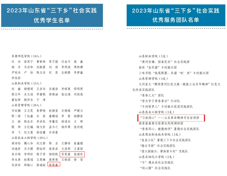 近日,团省委公布了2023年暑期“三下乡”社会实践活动获奖名单。其中,我院团总支获评“优秀组织单位”,孙琪、华晓晓老师获评“优秀指导教师”,宋家骏、张瑞农、张保鑫同学获评“优秀学生”,“习语润心”山东革命精神寻访宣讲团获评“优秀服务团队”。
