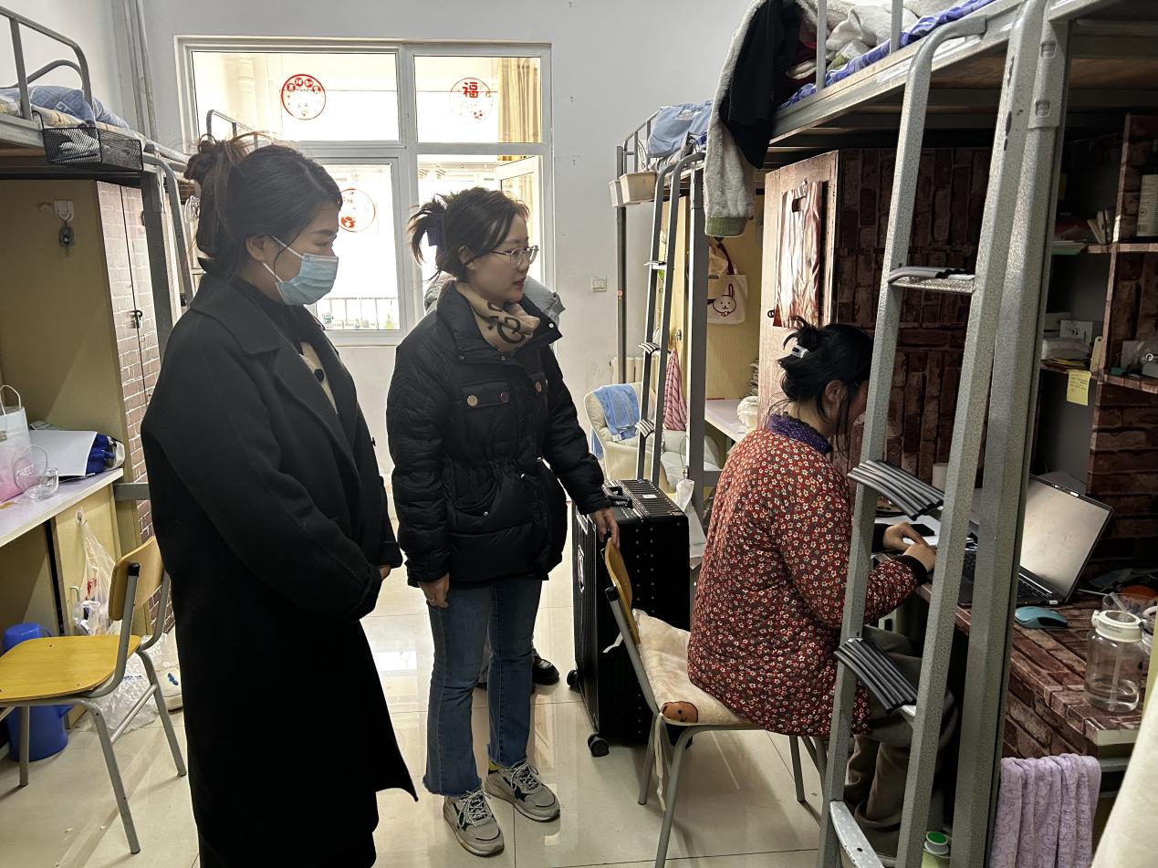 3月3日,我院党总支书记王猛、副书记赵侃带领学院全体辅导员深入学生宿舍与同学们亲切交谈,重点了解了学生返校后的情况,详细询问了学生寒假学习状况与新学期规划,同时叮嘱同学们注意用电安全、保持宿舍干净整洁,鼓励同学们在新的学期锐意进取,以积极的态度、饱满的热情迎接新一年的学习和生活。
