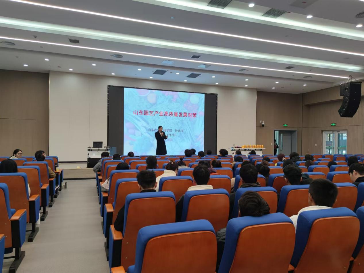 报告中,孙东文教授以专业视角深入分析了山东省园艺产业现状,指出当前发展的优势与面临的挑战。同时,他详细阐述了一系列高质量发展对策,包括品种改良创新、栽培技术优化、产业链拓展与融合等内容。精彩的讲解让师生们对山东省园艺产业有了更深刻理解,也为相关专业研究和实践提供了极具价值的指导方向,进一步激发了师生投身园艺产业发展研究的热情。