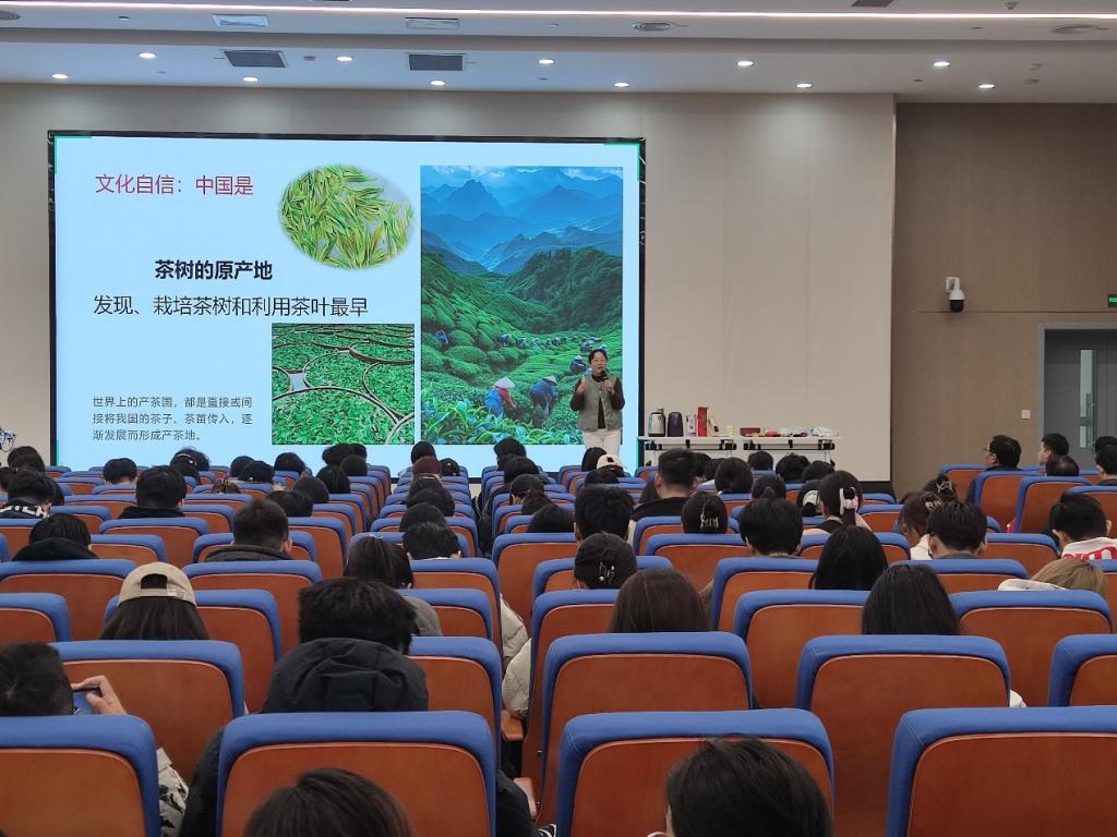 秦旭教授从茶叶的起源娓娓道来,讲述了古老传说与历史文献中茶叶出现的踪迹,让大家对茶叶悠久的历史有了清晰认知。接着,秦教授剖析了茶叶的种类,无论是绿茶的清新、红茶的醇厚、乌龙茶的芬芳还是黑茶的独特韵味,都在教授的讲解下变得生动形象,大家仿佛能透过言语感受到不同茶叶的香气。同时,秦旭教授还解密了茶叶背后丰富的文化内涵,从文人墨客的诗词歌赋到百姓生活中的礼仪习俗,茶叶所承载的文化价值深深触动着在场师生。