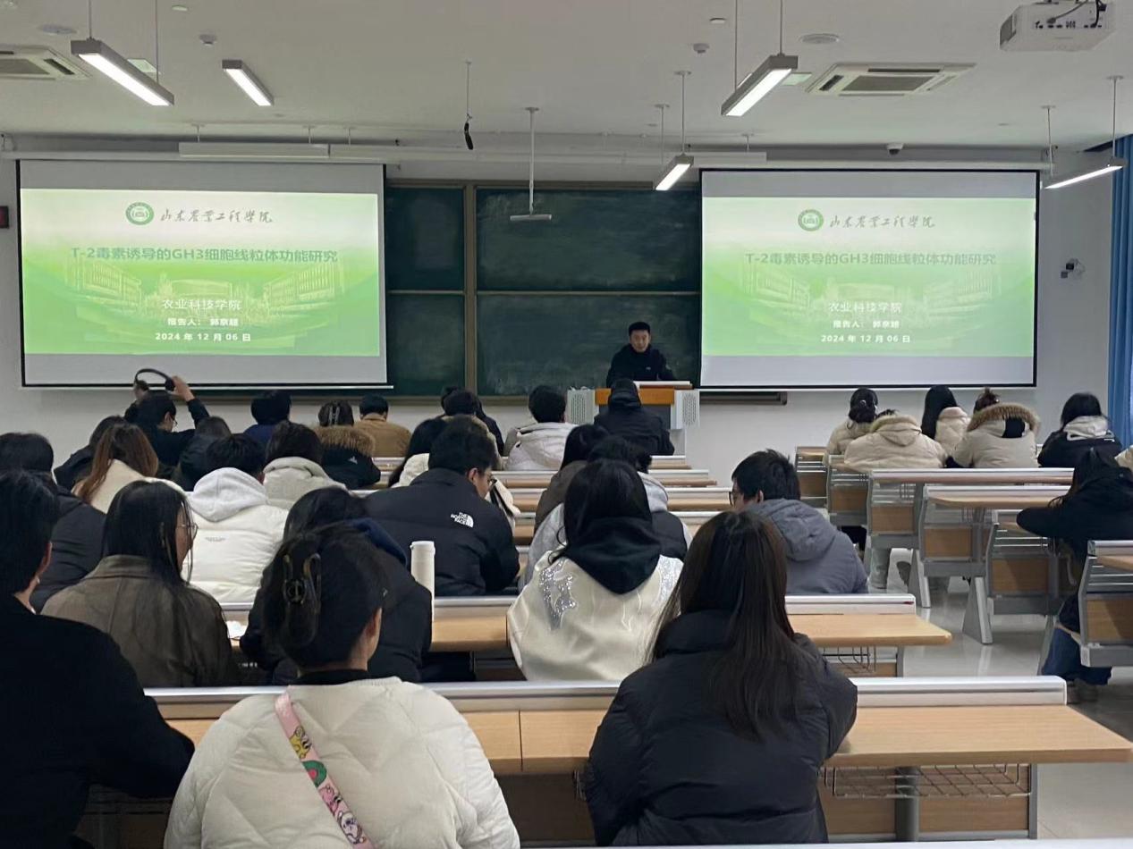 12月6日,淄公南楼A205教室,郭京超博士为我院动物医学专业部分师生作了一场题为《T-2毒素诱导的GH3细胞线粒体功能研究》的学术报告会。