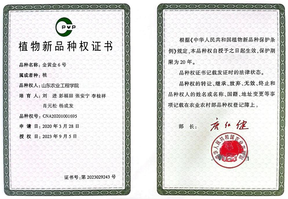 bat365正版唯一官网果树种质创新与现代高效栽培团队选育的‘金黄金6号’桃入选2025年山东省农作物优良品种推广目录。此次全省共有4个桃品种入选该推广目录,标志着该品种在丰产性、抗逆性及市场推广价值方面获得权威认可。