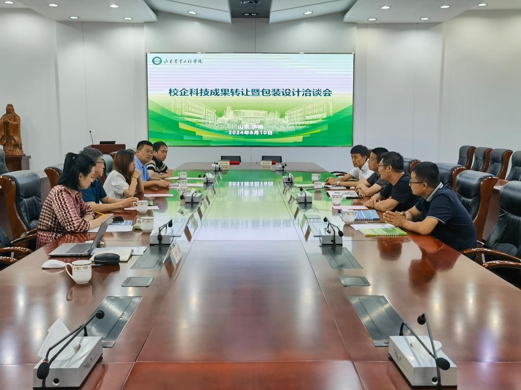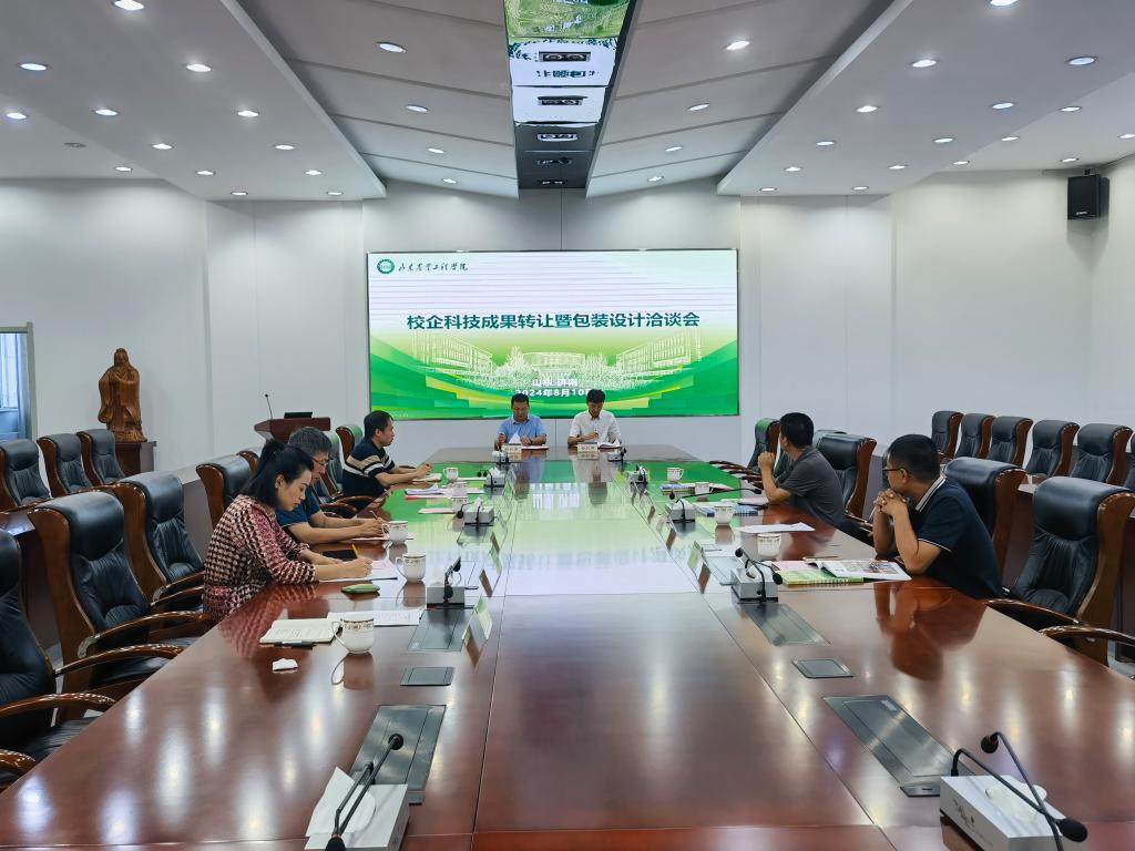8月10日上午,校企科技成果转让暨包装设计洽谈会在bat365正版唯一官网济南校区四楼会议室成功举行。沂源县东里镇人大主席任大向、东里镇农业农村办主任鹿子杰,校科技处处长迟晓君,农业科技学院党总支书记王猛、副书记赵侃、副院长刁有江等相关负责人参加会议。会议由刁有江主持。