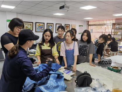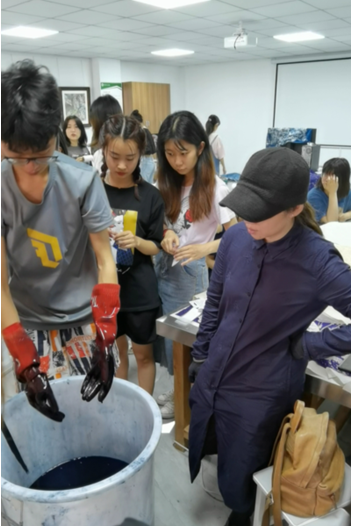 周老师主要是针对《手工印染艺术》课程中师生们遇到的困惑给予现场指导教学。首先,周老师与任课教师们进行了专业方面的交流,对教师们在教学过程中遇到的困难和问题给予相应的建议与解决方案,尤其是扎染、印染过程中的上色以及图案的成形、显色、固色等方面的实操环节提出了改良方案。随后,周老师亲自给学生们示范了印染艺术中最重要的一环,“快速建缸”,在操作步骤、用料配比及时间把控上作了详细的讲解说明,在周老师专业的指导下,学生们很快学会了方法并加以实践,作品的效果有了明显的改进。最后周老师耐心的解答了学生们在创作过程中的诸多问题,并在技法、构图,以及画面的粗细线条、疏密节奏的把握上给予专业指导。同时周老师也感慨,印染艺术创作过程有诸多不可控的因素影响作品效果,对艺术的感受力、领悟力也因人而异,适当保留自然而然产生的肌理感也不失一种新颖的表现方式,鼓励学生们大胆创新,勇于实践,积累经验。