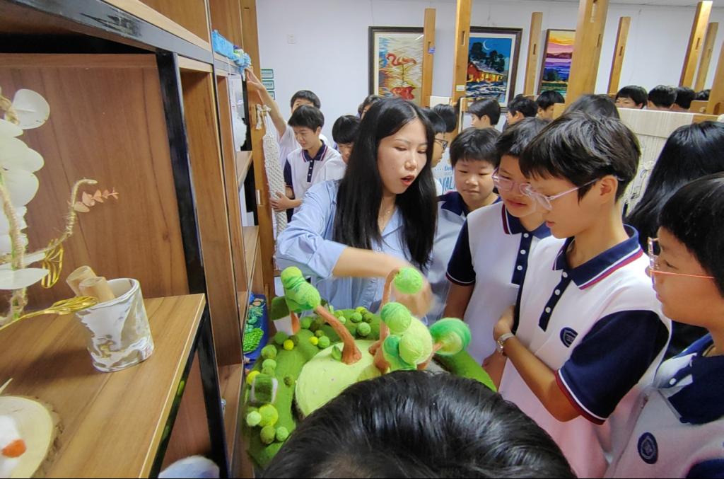 9月21日上午,历城双语实验学校的学生们在老师和部分家长的带领下,排着整齐的队伍来到校园,走进艺术学院工艺美术实验室和小展厅。学院实验室的专业老师为同学们讲解了传统印染、陶艺、漆艺、掐丝珐琅等传统工艺是怎样利用传统工艺制作出精美的手造工艺品的,同时还给同学们科普了一些现代技术在工艺品开发中的应用,包括实验室的一些高科技设备,如高温窑炉、布料印刷机、电脑辅助设计、拉胚机等的功能和作用。