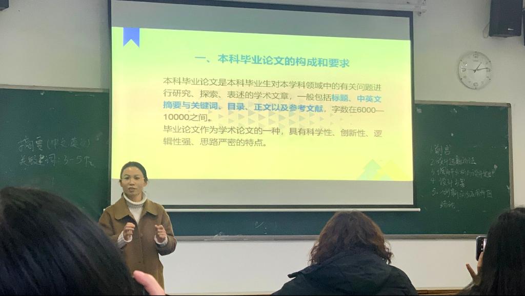 毕业论文写作是我院本科毕业设计的重要环节,是对学生专业素养的综合性检验和考核,如何顺利完成毕业论文写作是学生的重点和难点工作。鉴于学生缺少论文写作经验,在本次报告中,李委委老师围绕本科毕业论文的结构和要求,从论文的摘要、关键词、目录、正文、参考文献等几部分内容展开详细讲解。针对每部分内容,分享了论文写作的经验和方法。