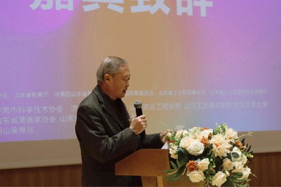 中国美术家协会漫画艺委会主任、山东漫画家协会主席陈黎青发表讲话。他从艺术创作的角度,与学生们分享创作心得,对青年学生和动漫从业者提出要求和期许。他认为,漫画艺术不同于其他画种,要深入观察和感悟生活,思想性和艺术性相得益彰,才能赋予漫画作品无限的生命力。漫画内容从生活中来,要符合生活的规律,但又必须高于生活,同时还具有哲理性、幽默性、趣味性。好的漫画作品属于意料之外,却在情理之中,除了要有深厚的幽默感,还必须蕴含强烈的社会责任感。
