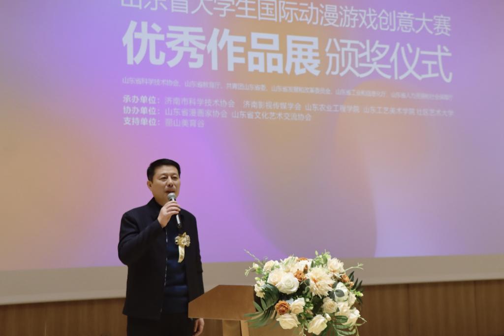 中国高等教育学会摄影教育专业委员会副会长、山东漫画家协会副主席、济南影视传媒学会主席、本届大赛组委会主任王传东教授代表组委会致辞。他对本届大赛的组织情况进行了说明,对大赛成果进行了总结,他表示,在政府主管部门和省市科协的正确指导下,在各高校同仁和行业企业的大力支持下,动漫大赛已成为大学生展现自我风采、提高实践能力的舞台, 成为高等院校和行业企业交流合作、协同发展的平台, 有力地促进了我省动漫专业建设和动漫产业健康可持续发展。