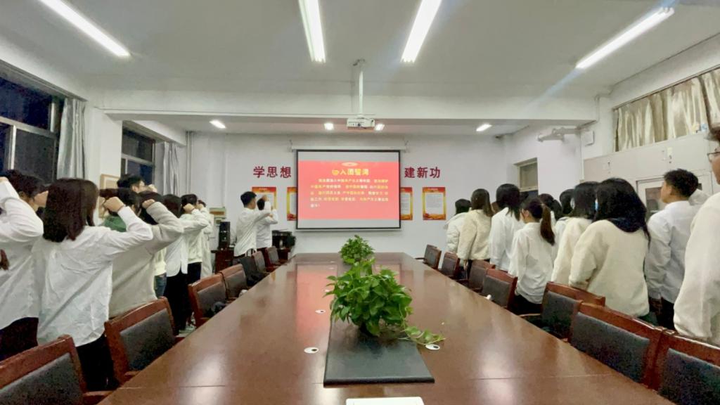 最后,22级视传三班团支书刘乐义同学作为领誓人,带领大家进行了宣誓。各位团员面对团旗,紧握右拳,庄严宣誓:“我志愿加入中国共产主义青年团,坚决拥护中国共产党的领导,遵守团的章程,执行团的决议,履行团员义务,严守团的纪律,勤奋学习,积极工作,吃苦在前,享受在后,为共产主义事业而奋斗!”