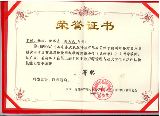 2019年5月11-12日,由教育部公共管理类教学指导委员会土地资源管理分委会,全国高校土地资源管理院长(系主任)联席会主办的第三届全国土地资源管理专业大学生不动产估价技能大赛在中国矿业大学(徐州)举行。本次大赛共设特等奖3项,一等奖5项,二等奖9项,三等奖20项,bat3652016级土地资源管理专业学生贾琦、杨璐、徐伟豪、刘昊天的作品《德州市齐河县马集镇黄河湾国有农用地使用权收购价格评估》在比赛中荣获二等奖。