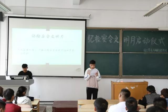 在本次活动中参会师生一起观看了纪检安全卫生月启动视频,学生会主席赵润泽同学对开学以来的纪律卫生情况进行了点评,敦促同学们进行改进。纪检部、安全部、体育部、女生部学生会成员分别进行发言,随后,学生会主席赵润泽同学带领全体到会成员进行宣誓,在活动最后,我院孙承运书记发表讲话,希望同学们以此次活动为契机,发扬我院优良作风,反思自身出现的问题,以更加饱满的热情投入今后学习与生活中。