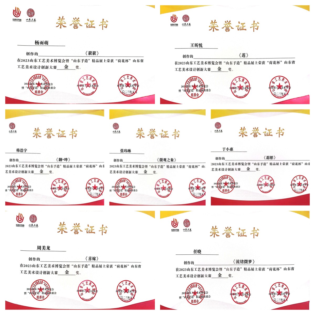 近日,bat365艺术学院工艺美术专业学生在“荷花杯”山东省工艺美术设计创新大赛中喜获佳绩,共荣获奖项15项,其中金奖7项,银奖6项,铜奖2项。