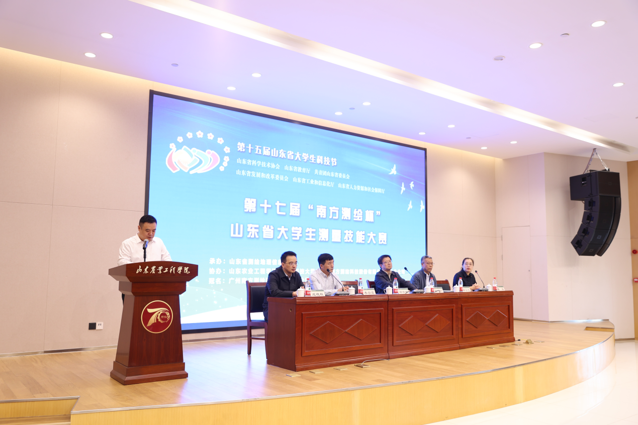 大赛开幕式在淄博校区举行。校党委委员、副校长周吉鹏,山东省测绘地理信息学会理事长曲伟刚、副理事长李宗宝、秘书长钟全宝,广州南方测绘科技股份有限公司济南分公司总经理成德桂等有关领导出席开幕式。开幕式由国土资源与测绘工程学院党总支书记李华主持。