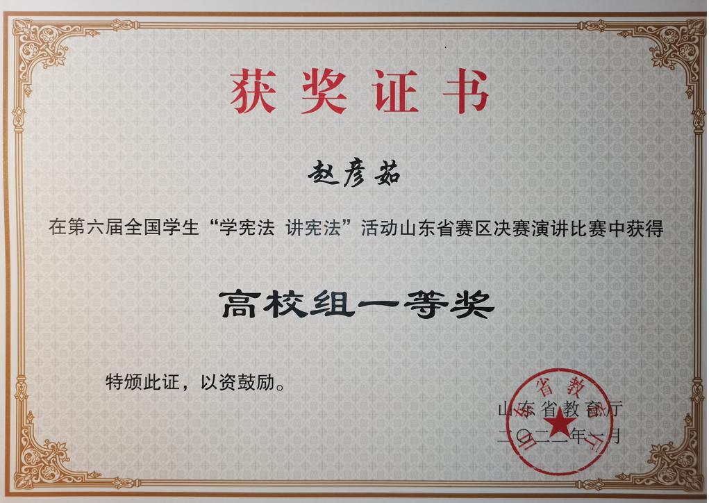 近日,山东省教育厅公布的关于第六届学生“学宪法讲宪法”活动开展情况的通报中,bat365被评为先进单位,两名老师被评为先进个人,两名老师被评为优秀指导老师,农业科技学院学生赵彦茹同学获得演讲比赛一等奖。