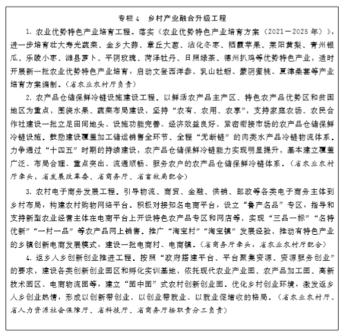(五)千镇融合互动。围绕区域特色种养业、特色加工业、特色文旅业,以“绿色化全产业链发展,一二三产业融合、创新创业平台支撑”为路径,打造标准化原料生产、集约加工转化、品牌市场营销于一体,区域主导产业优势突出、利益联结机制完善的农业产业强镇。以产业发展为依托,吸引资本聚镇、能人入镇、技术进镇,建设一批区域性产业重镇。发挥城镇连接城市、服务乡村作用,构建县、乡、村融合发展新格局。到2025年,全省创建1000个以上省级农业产业强镇。